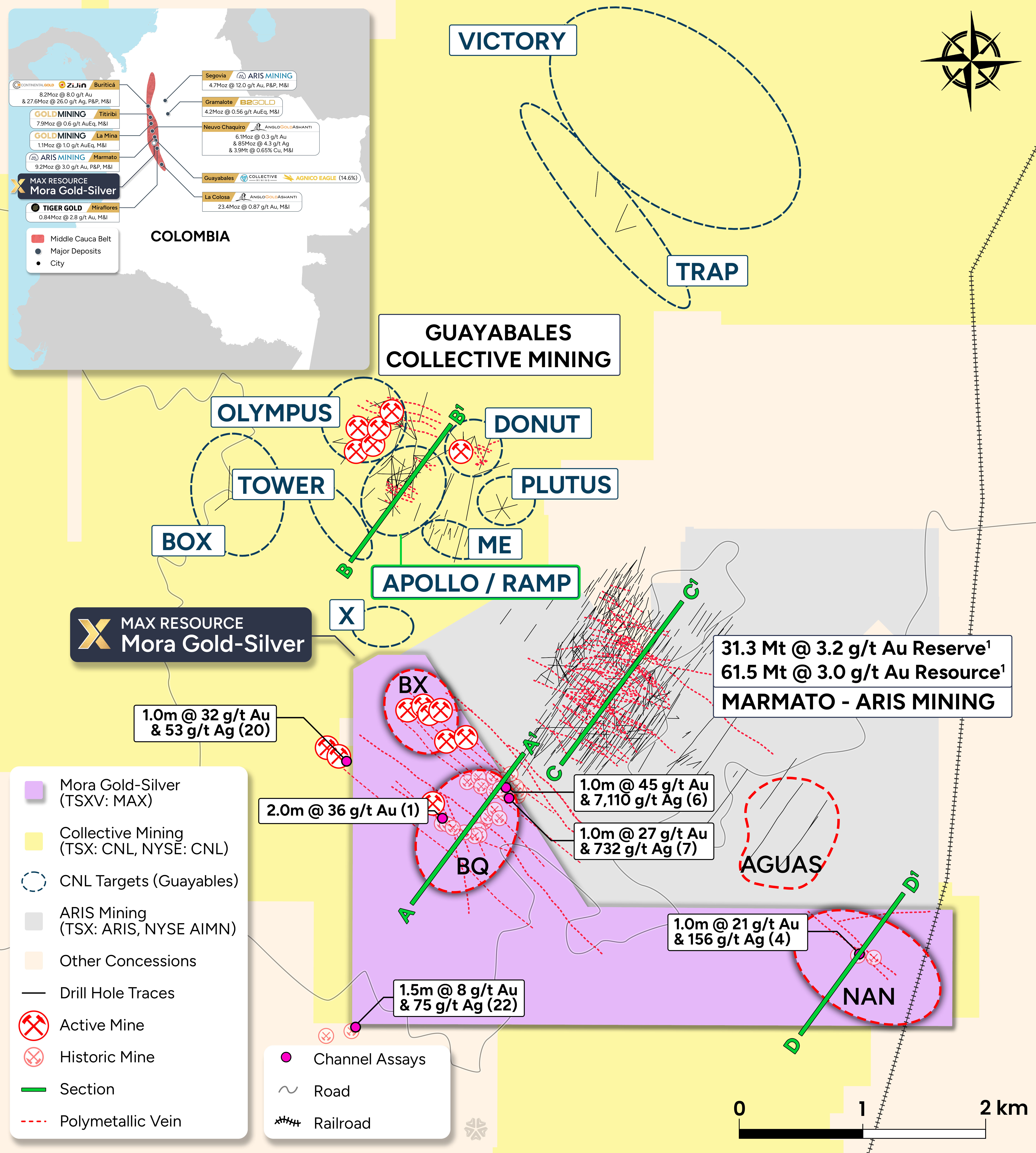 Mora Gold Silver in Colombia (right to purchase 100%) lies along the most productive Middle Cauca Gold Belt encompasses over 40 historic workings, 5 active mines, a series of exposed polymetallic structures spread over 2,500m by 1,000m. Mora's 8.2 km border is surrounded by Collective Mining's (TSX, NYSE: CNL) Guayabales Gold Project and Aris Mining's (TSX: ARIS, NYSE: ARMN) Marmato 9.2Moz¹ gold operations.