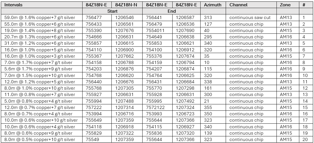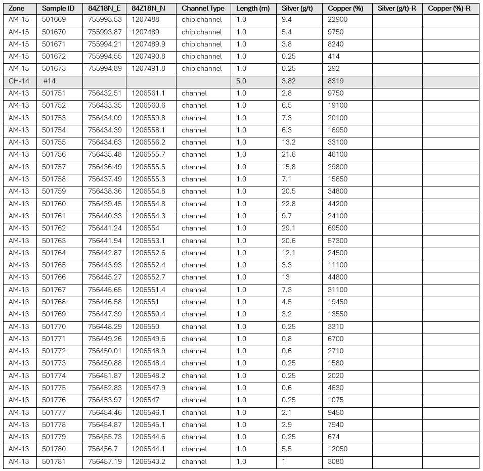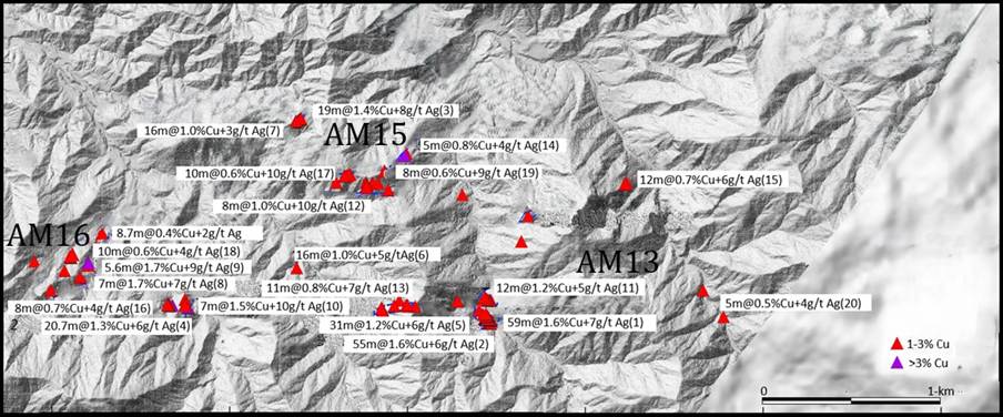 AM16 - located approximately 1,800m to the west of AM13. Mineralization is found in veinlets and filling cavities within andesite, agglomerate and breccias. The mineralized rocks show hydrothermal overprinting and a chalcocite rich matrix. Epidote lenses with high native copper content are present in joints that are parallel to and cross-cut the bedding. Ore forming minerals include malachite, chalcocite and native copper.