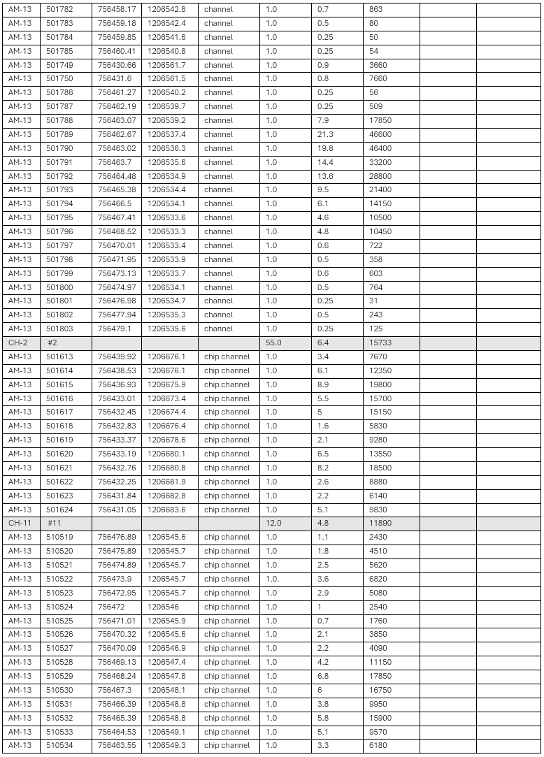 AM13 - the mineralization is hosted in an andesitic tuff (a type of volcanic rock) that strikes 50⁰, dips 70⁰ northwest and has been structurally prepared by faulting. The first mineralized outcrops were discovered in the Cedro valley and subsequent continuous saw-cut channel sampling returned 1.8% copper & 7.2 g/t silver over 48.0m