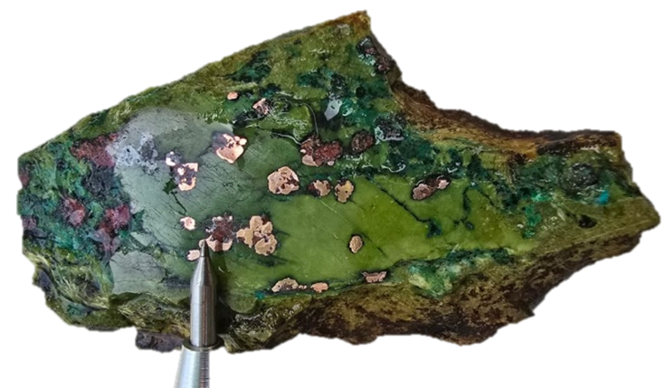 Figure 3: Mineralized andesite showing epidote-altered lense with native copper.