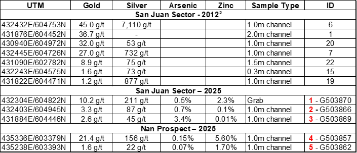 Table 1: Highlight Assay Results for 2012² and 2025 Field Investigations.