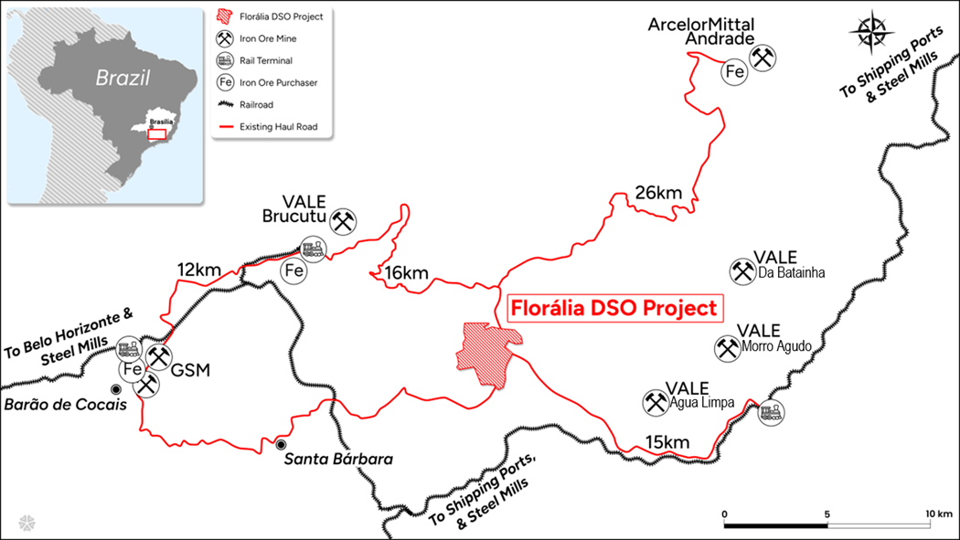 The Florália Iron Ore Property lies within Minas Gerais, Brazil’s largest iron ore and steel producing State. The Property has established road access to rail terminal (15 km) linking to steel mills and shipping ports; roads connect to DSO buyers Vale (16 km) and ArcelorMittal (26 km) ensuring efficient logistics and market access. Max’s technical team has significantly expanded the Florália Hematite DSO Geological Target from 8-12Mt at 58% Fe to 50-70Mt at 55%-61% Fe (refer Figure 2).